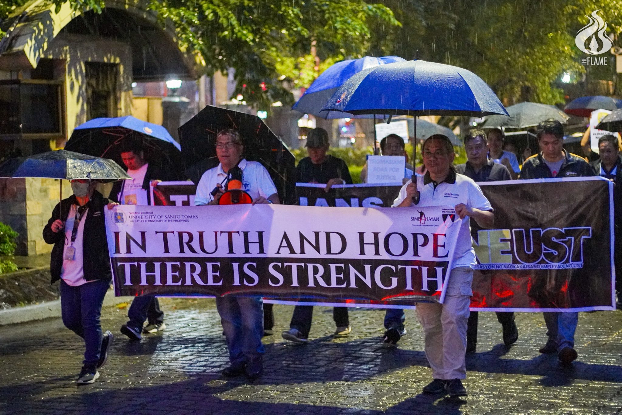 UST faculty, personnel, students, alumni and administrators attended the solidarity night, which echoed calls for the Marcos administration to act on the alleged pocketing of billions from state flood control projects. It was organized by representatives from the University’s labor unions, student and alumni groups and the UST administration.
