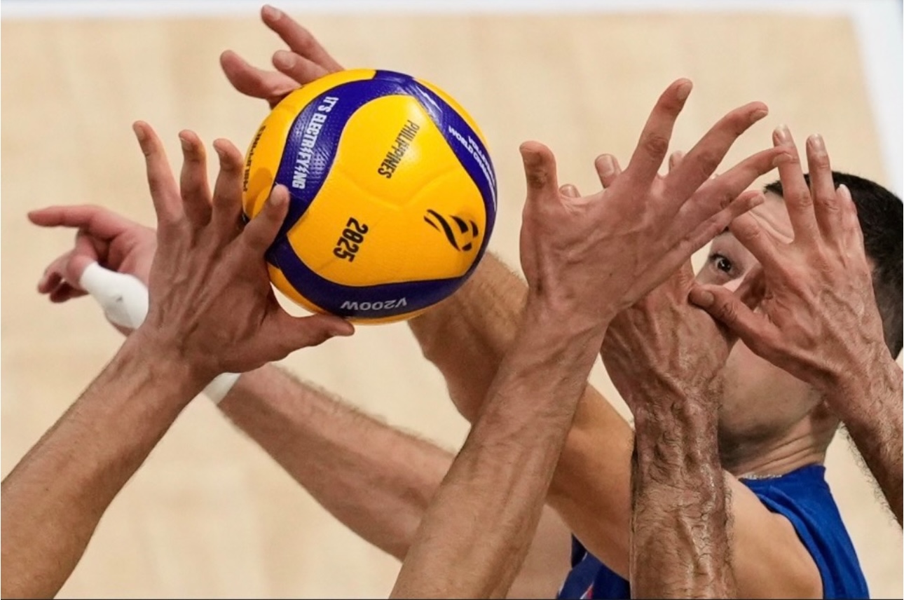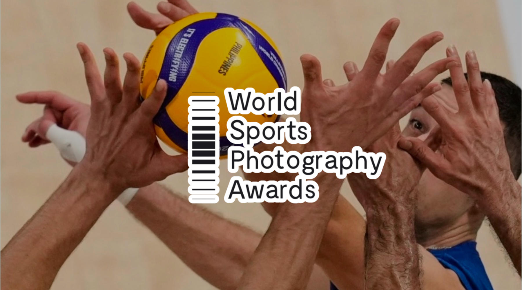 Aaron Favila’s photograph captures a high-intensity moment in men’s volleyball where an athlete’s eye is framed by the hands of other players, highlighting his concentration during competition.
