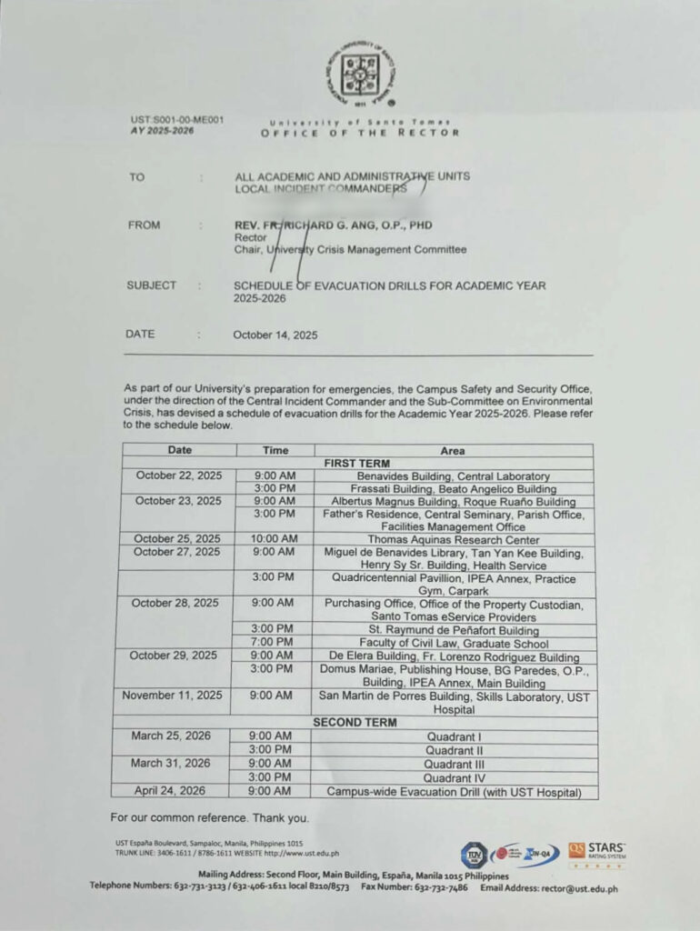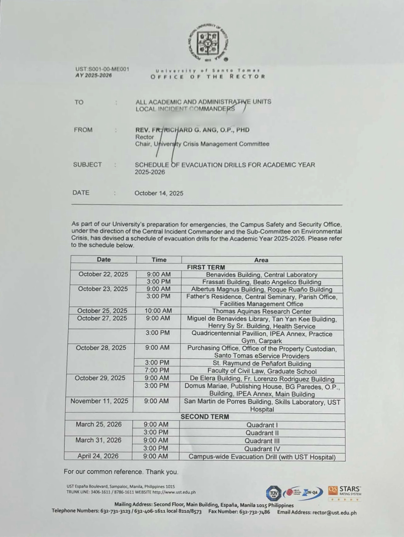 The University previously announced a series of earthquake drills for the second semester through a memorandum dated Oct. 14, with quadrants I and II scheduled for March 25, quadrants III and IV on March 31, and a campus-wide evacuation with UST hospital on April 24.